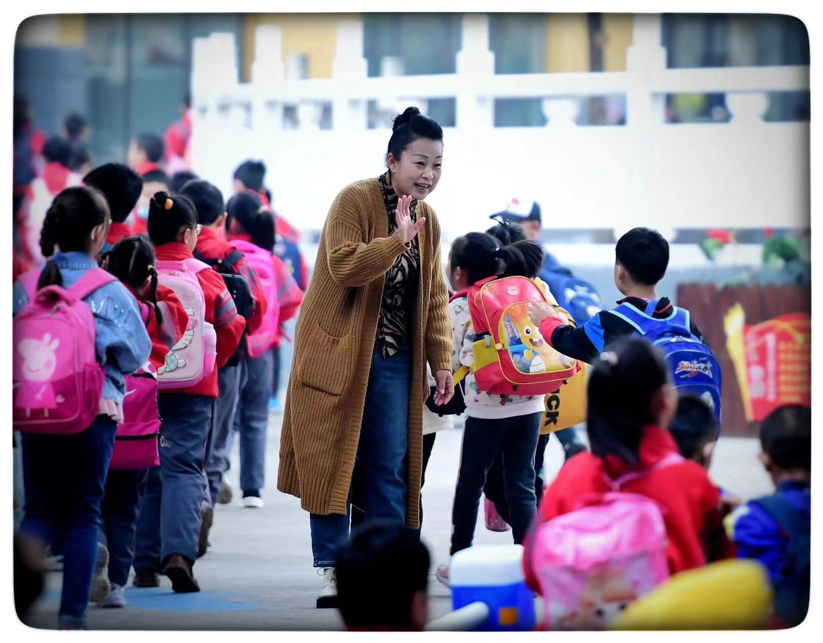 在上南街小学,学生们给李文平起了一个外号,叫“站神”,因为她每天都会提前几十分钟到学校,站在门口迎接师生,放学时也会提前到校门口和大家道别。一天四次,每次半个多小时,日复一日,从不间断,三年多来,李文平用这种现场办公的方式搭建起了家校共育的桥梁,渐渐地,家长找她反映问题的、告状的越来越少。“我现在在门口做的最多的事情就是传送,这个家长说:‘校长,孩子忘带作业了,麻烦您给了孩子。’那个家长说:‘校长,孩子的文具盒没拿,请您带给他。’”有人问她:李校长,你累不累?累,怎能不累?每天下班回家,腿是胀的,脚是肿的,去年冬天,李文平得了关节炎,膝盖肿的像个馒头,不能弯曲,还有积液,医生要求必须卧床休息。她晚上用盐袋敷、用艾灸烤,第二天贴个暖宝,戴上护膝准时准点地站在学校门口。“说实话,我也害怕风吹日晒损伤皮肤,我也担心积劳成疾,蹒跚了步履。但是,我不想让孩子们失望。前年我外出考察学习,走了一个多星期,回来后一群孩子围着我问东问西,有个孩子掉着眼泪说:‘校长阿姨,我还以为见不着你了呢’。所以,我必须得站在那里。”李文平说。有人觉得,校长天天做这些小事情,有意义吗?而在李文平看来,把一件件教育的小事做好了,就是做好了教育的大事。