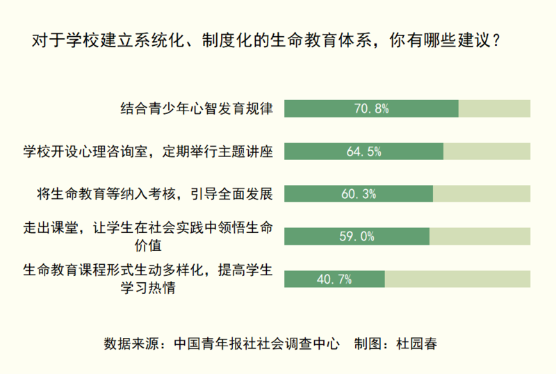 对于学校建立系统化、制度化的生命教育体系,中国青年报社社会调查中心联合问卷网(wenjuan.com)进行的一项调查显示,70.8%的受访者建议结合青少年心智发育规律,64.5%的受访者希望学校开设心理咨询室,定期举行主题讲座,60.3%的受访者期待将生命教育等纳入考核,引导全面发展,59.0%的受访者认为得走出课堂,让学生在社会实践中领悟生命价值,40.7%的受访者希望生命教育课程形式生动多样化,提高学生学习热情。